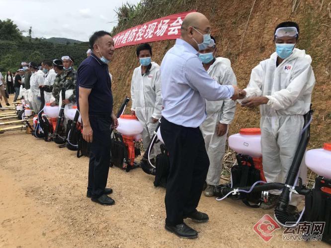 会上,云南省及迁入黄脊竹蝗的3个重点市(州)2个重点县(市)分别介绍前期黄脊竹蝗迁入及应急防治情况,广西、四川、贵州介绍境内黄脊竹蝗发生情况,有关专家对发生形势进行分析。在离中老边境线不足5公里举行的黄脊竹蝗应急防控实战演练活动中,植保作业人员组织机动喷雾组、无人机组和烟雾机组依序开展作业,针对农林山区特殊地形,空中与地面防治相结合,全面歼灭发现蝗虫,专家评估此次演练防治率达90%,有效降低黄脊竹蝗扩散危害。