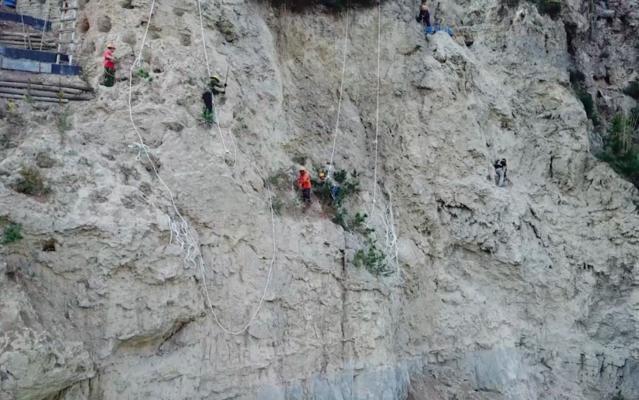 修一条上山的路,这是张俊平面临的第一个难题。对于开矿留下的陡峭山体,需要先用大型机械削成能站人能栽树的斜面。而人员难以站立的斜坡,就要安装木栈道。张俊平带领工人们吃住在山上,历经风吹日晒、千辛万苦,一锤一锤打好木栈道、铺设了一条上山的路。