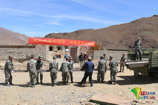 盛夏的日光里,这个海拔4000米之上的村落繁忙起来,装有建筑物料的大卡车开进了村,部队官兵将钢筋抬到院子里,村民正在堆放砂石和水泥。按照普夏村军地扶贫的规划,村里的第一个藏鸡养殖场正在建设。