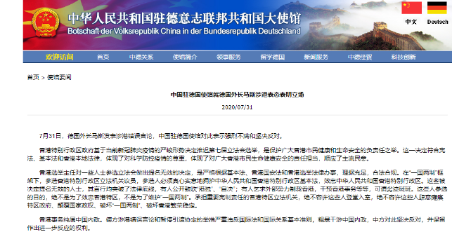 7月31日,德国外长马斯发表涉港错误言论,中国驻德国使馆对此表示强烈不满和坚决反对。