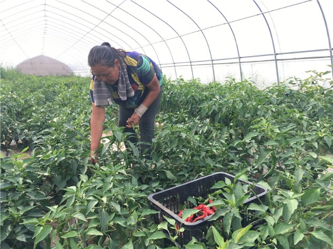 灵台县什字镇北河村村民在蔬菜大棚内采摘成熟的辣椒。景洁摄