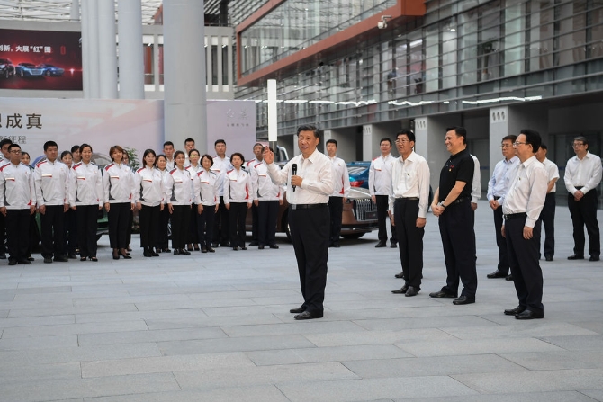 7月22日至24日,中共中央总书记、国家主席、中央军委主席习近平在吉林省考察。这是7月23日下午,习近平在长春市一汽集团研发总院,同职工代表亲切交流。新华社记者 燕雁 摄