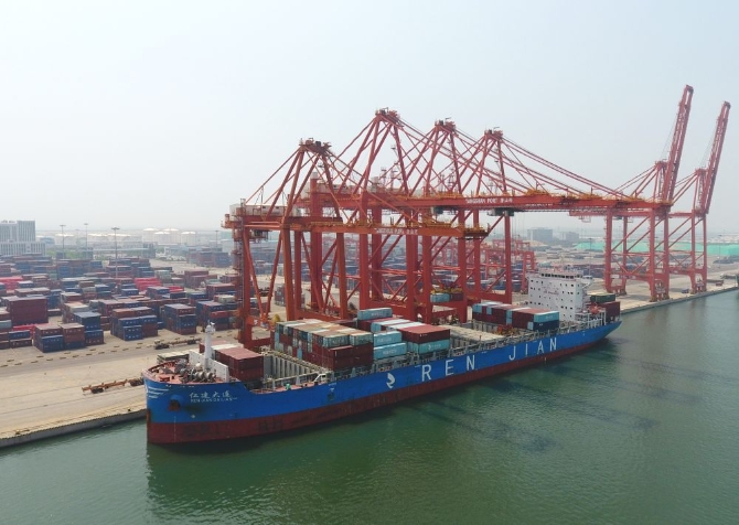 7月16日,一艘轮船靠泊在唐山港京唐港区集装箱码头装货。新华社记者 杨世尧 摄