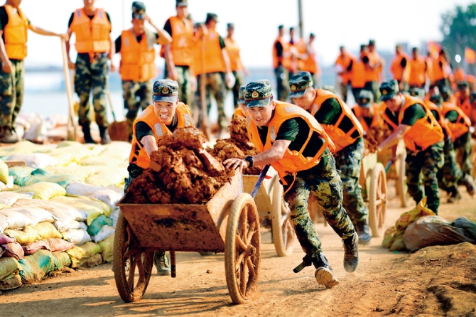 2020年7月以来,我国多地遭遇持续强降雨,发生严重洪涝灾害。人民至上、生命至上。提前转移、紧急营救、妥善安置……一场涉及上百万群众生命的生死竞速就此拉开。图为2020年7月17日,武警江西总队机动支队党员突击队在江西省鄱阳县鄱阳镇昌江圩用推车将余土推到空地堆放。 新华社发 曹先训/摄