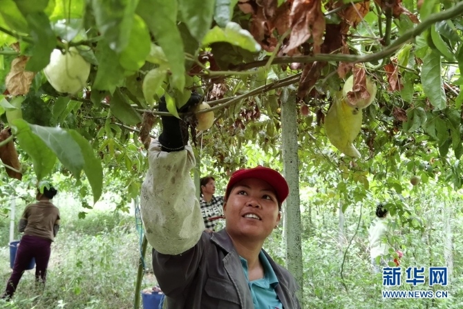 在洞浪百香果基地务工的村民正在采摘百香果。新华网 刘君/摄