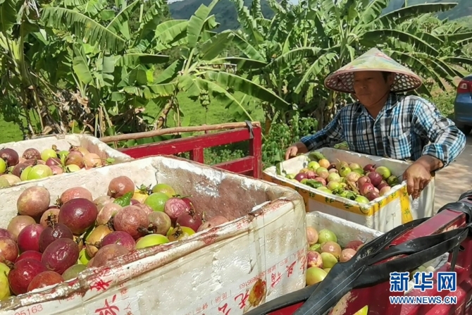 在洞浪百香果基地务工的村民正在将百香果搬运上车,准备运往扶贫车间打包销售。新华网 刘君/摄