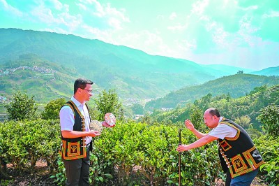 两位重庆大学扶贫挂职干部在茶园为绿春县茶叶直播带货。