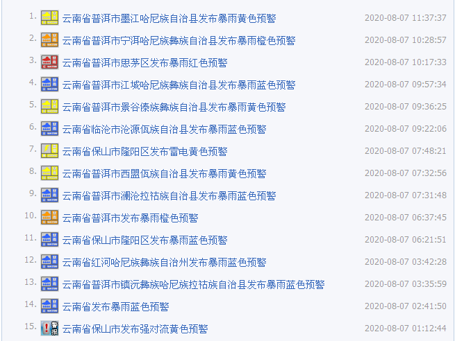 8月7日8时49分,云南省自然资源厅和云南省气象局联合发布地质灾害气象风险橙色预警,预计8月7日8时—8月8日8时,昭通,怒江,德宏及红河部分地区发生滑坡泥石流等地质灾害的风险高(橙色预警);昭通、曲靖,怒江、丽江、大理,德宏、保山,临沧、普洱、西双版纳,红河,文山,楚雄及玉溪部分地区发生滑坡泥石流等地质灾害的风险较高。