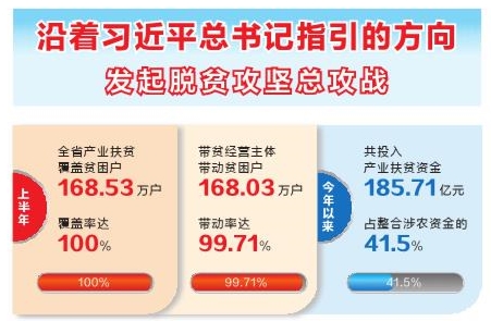 今年以来,各级农业农村部门认真落实省委、省政府脱贫攻坚决策部署,强化工作措施,扎实推进产业扶贫,巩固提升扶贫成果。上半年,全省产业扶贫覆盖有发展条件的贫困户168.53万户,覆盖率达100%;各类带贫新型经营主体达2.85万个,带动贫困户168.03万户,主体带动率达99.71%。