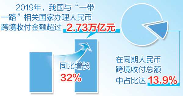 报告显示,2019年我国与“一带一路”相关国家办理人民币跨境收付金额超过2.73万亿元,同比增长32%,较3年前提高逾1倍,在同期人民币跨境收付总额中占比达13.9%。其中,货物贸易收付金额7325亿元,直接投资收付金额2524亿元。