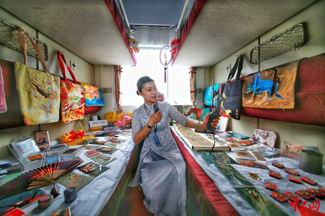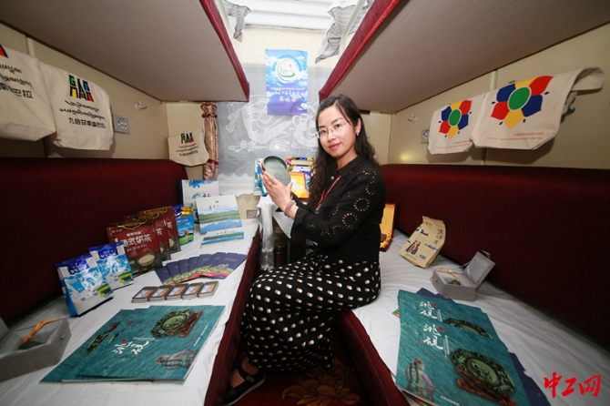 在环西部火车游列车上,来自天水市文旅局网红达人在摆满文旅产品的软卧超市进行现场直播。曹文福摄