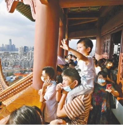8月9日,黄鹤楼,长江日报记者发现许多外地游客第一次来武汉就享受到免费游黄鹤楼的福利。长江日报记者高勇 摄