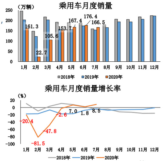 具体来看,7月我国汽车产销分别达到220.1万辆和211.2万辆,环比下降5.3%和8.2%,同比增长21.9%和16.4%;1-7月累计产销量为1231.4万辆和1236.5万辆,同比下降11.8%和12.7%,降幅与1-6月相比,分别收窄5.0个百分点和4.2个百分点。