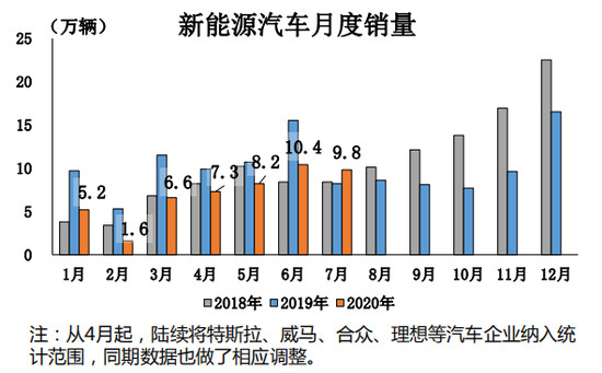值得注意的是,新能源汽车7月产销同比增速已由负转正,为今年来首次增长。虽然,1-7月新能源汽车累计产销,仍同比下降31.7%和32.8%至49.6万辆和48.6万辆,但7月已实现产销10万辆和9.8万辆,同比增长15.6%和19.3%。其中,7月纯电动汽车产销分别完成7.9万辆和7.8万辆,同比分别增长17.9%和24.2%;插电式混合动力汽车产销分别完成2.1万辆和1.9万辆,同比分别增长7.8%和2.7%。