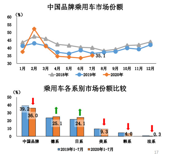 从国别品牌来看,中国品牌乘用车7月销量为58.5万辆,环比下降0.9%,同比小幅增长4.5%,占乘用车总销量的35.1%,市占率环比提升1.7个百分点,结束了自3月起的连续下降趋势。对此,徐海东分析称,疫情回暖初期(二季度)逐渐释放的是合资品牌潜在消费者的需求,所以期间合资品牌市占率明显增长。随着7月市场需求恢复常态,自主品牌市占率的回升也在意料之内。