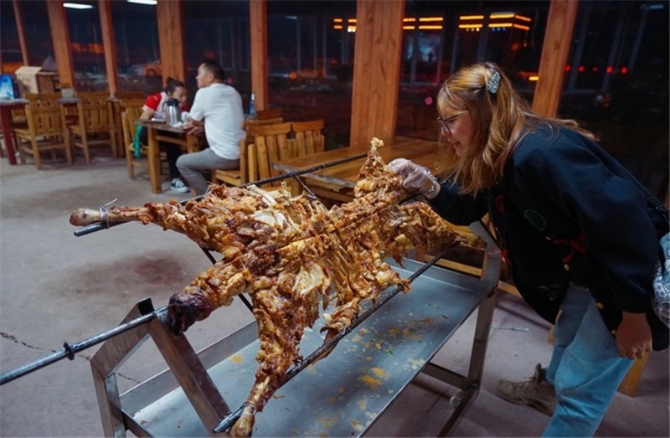 坝上草原风味的烤全羊可以说是采摘式吃法,需要烤制三次及吃三次。一只整羊用秘制调料腌制后明火烤制,撒上辣椒、孜然粉等调料,烤制外酥里嫩后,连烤架一起弄进餐厅里,然后众人用手撕着吃(这种吃法被我们称作采摘式吃法)。