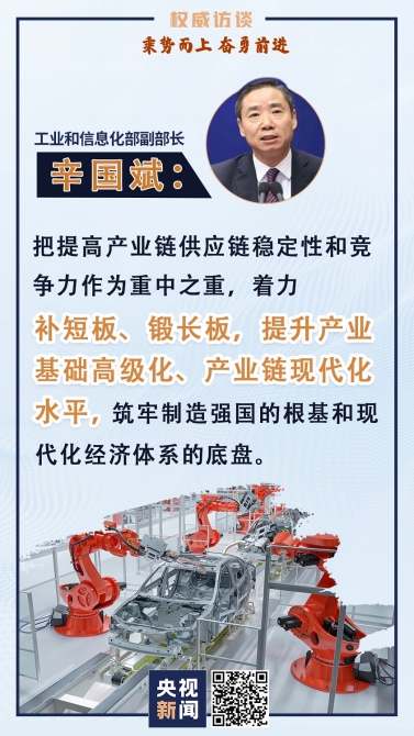工业和信息化部副部长 辛国斌:把提高产业链供应链稳定性和竞争力作为重中之重,着力补短板、锻长板,提升产业基础高级化、产业链现代化水平,筑牢制造强国的根基和现代化经济体系的底盘。(总台央视 记者孙蓟潍 董羽 杜雷鸣 张勇 于潭)