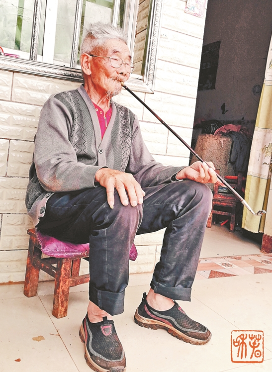 普顺发家新建的房子位于村口,老人红光满面,精神矍铄,端坐窗下,抬着长烟锅,气定神闲。但近年他听力下降,交谈不便,我们主要向他的儿子普宜生了解大刀舞的传承情况。普宜生从前当过小学老师,现在是村里的记账员,也是毕摩传承人。
