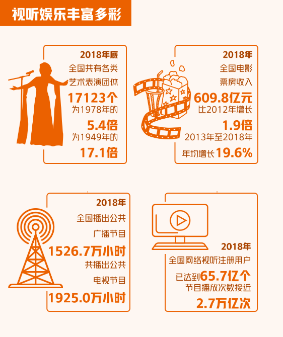 当前,现代公共文化服务体系建设取得重要进展,公共文化领域法律政策进一步完善,公共文化服务财政保障进一步加强。基本建立了覆盖城乡的六级公共文化设施体系,公共文化领域的产品和服务日益丰富。数据显示,目前全国共有县级图书馆2753个、文化馆2938个、乡镇综合文化站33997个、农家书屋64万个。公共文化服务的推进使得群众获取信息的渠道更加多元,文化生活也更加丰富多彩。