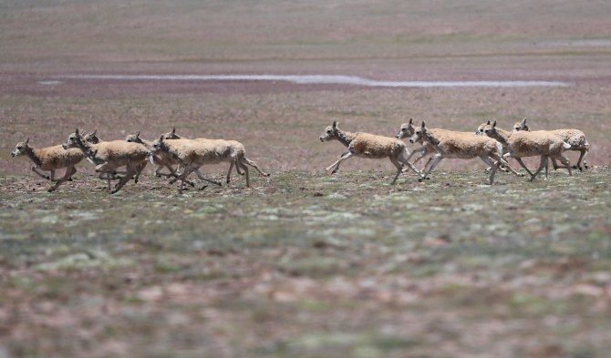 从7月底开始,在可可西里“藏羚羊产房”卓乃湖区域结束产仔的藏羚羊携幼仔陆续回到原栖息地。可可西里藏羚羊目前进入回迁高峰期。