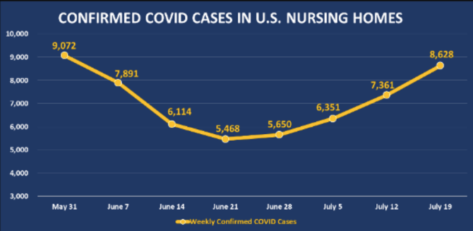 △疗养机构的确诊病例6月份时有所下降,但在7月份显著回升 来源:美国卫生保健协会和美国国家辅助生活中心(AHCA / NCAL)