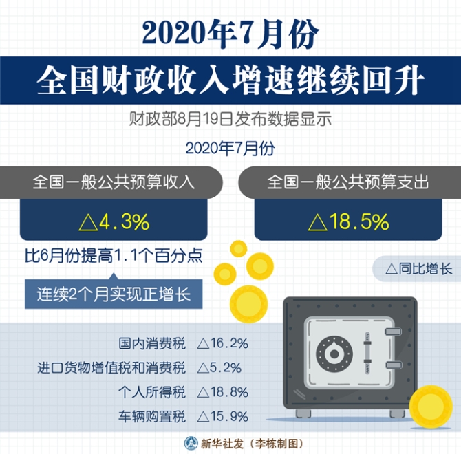 新华社北京8月19日电(记者申铖)财政部19日发布数据显示,7月份,全国一般公共预算收入同比增速达4.3%,比6月份提高1.1个百分点,连续2个月实现正增长。