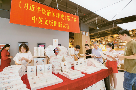 《习近平谈治国理政》第三卷的出版发行,是全党政治生活中的一件大事,对于推动广大干部群众学懂弄通做实习近平新时代中国特色社会主义思想、帮助国际社会更好了解这一重要思想的主要内容,具有重要意义。图为2020年7月3日,浙江省瑞安市新华书城,市民在《习近平谈治国理政》第三卷中英文版专柜前专心阅读。中新社发 孙凛/摄