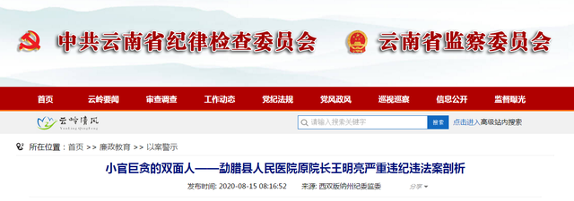 近日,春城晚报-开屏新闻记者从云南省纪委监委网站获悉,该网站以《小官巨贪的双面人——勐腊县人民医院原院长王明亮严重违纪违法案剖析》为题,详叙了这名34岁便当上县医院院长的当地名医,是如何一步步堕落的。