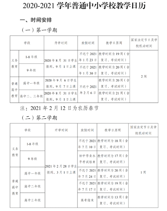 2020年8月31日报到,9月1日上课;寒假时间不迟于2021年2月6日;
