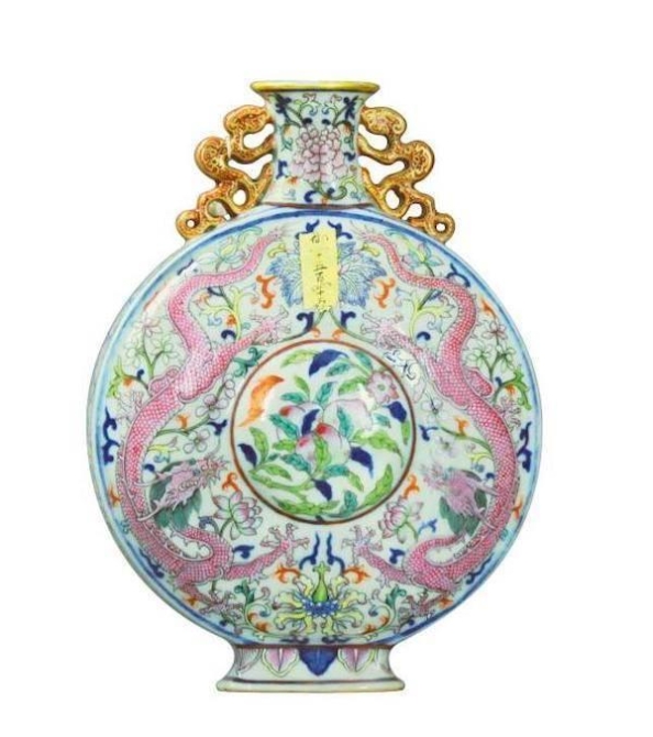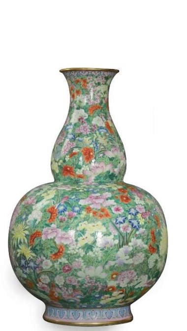 乾隆洋彩万花献瑞图大吉瓶在乾隆彩瓷中堪称别致,巧取瑞果葫芦为形,通体装饰雍容华丽,画面中百花争妍,千姿百态姹紫嫣红。或低枝倾斜垂弓而复昂,取势自然;或花团锦簇,娇态盈盈,聚散有致;所有花卉皆造型严谨,意趣鲜活。花朵以重粉铺填,层次丰富,明净典雅;花叶大小,向背深浅不一,穿插合理。种类极多,不胜分辨,使人仿佛置身百花丛中,目不暇接。据主办方介绍,这件作品属于传办性质的供御器皿。传办瓷器是皇帝根据自身需要或清宫特定原因临时加派烧造的瓷器,具有鲜明的个性化要求,数量罕见,制作尤精,不惜工本,皇帝本人往往深入参与其中之设计和最后定夺。例如此件作品的烧制,首先需要内务府造办处出具画样,设计出百花齐聚之画稿,交付御窑厂作为粉本。