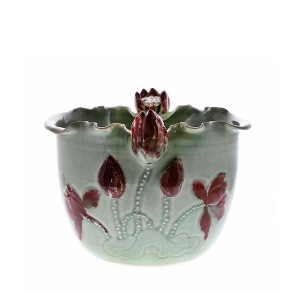 其中康熙豆青釉里红荷花缸,此缸以仿生造型作收拢之荷叶,口沿作荷叶翻卷外侈,造型隽雅优美,洗炼柔婉。通体施豆青釉,釉色臻纯剔透,器壁贴塑釉里红荷花蕾与器型之美相结合。烧制此种高水平之豆青釉里红器物色,于康熙一朝同类作品中为数翘楚之作。英国维多利亚&阿尔伯特博物馆有一件藏品与此件器型和纹样几乎一致,或应为成对之作,可兹比较。这件作品源于英国著名收藏家亚历山大先生,资料显示此物于1900年来自于北京。据考,此缸原为圆明园之物,后辗转流到英国。