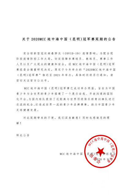 8月25日,记者从MCC地中海中国(昆明)冠军赛组委会获悉,受全球新型冠状病毒肺炎疫情影响,为配合现阶段疫情防控工作大局,切实保障参赛球员、教练员、赛事工作人员以及广大观众的健康和安全,经MCC地中海中国(昆明)冠军赛组委会慎重研究决定,原定于今年举办的“2020MCC地中海中国(昆明)冠军赛”推迟至2021年举办,具体时间将另行通知。