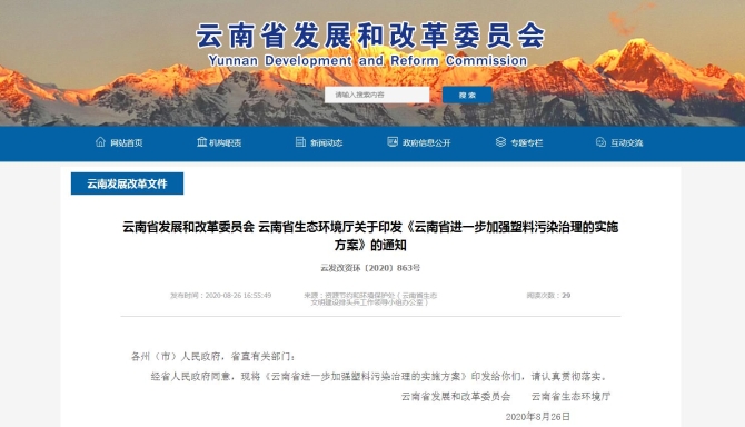8月26日,云南省发展和改革委员会、云南省生态环境厅对外发布的《云南省进一步加强塑料污染治理的实施方案》显示,从今年起至2025年,云南将有序禁止、限制部分塑料制品的生产、销售和使用,积极推广替代产品,其中今年率先在昆明市等地禁止或限制塑料制品产售和使用。