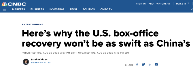CNBC认为,中国电影票房的回暖证明,只要有时间和足够的安全指导,观众将成群结队地回到影院。在确诊病例较少的情况下,中国已经能够从8月中旬开始,将影院观众上限从7月份的30%放宽至50%。“如果确诊病例数继续减少,影院可能很快就会被允许接待更多观众。”