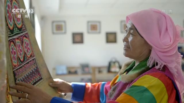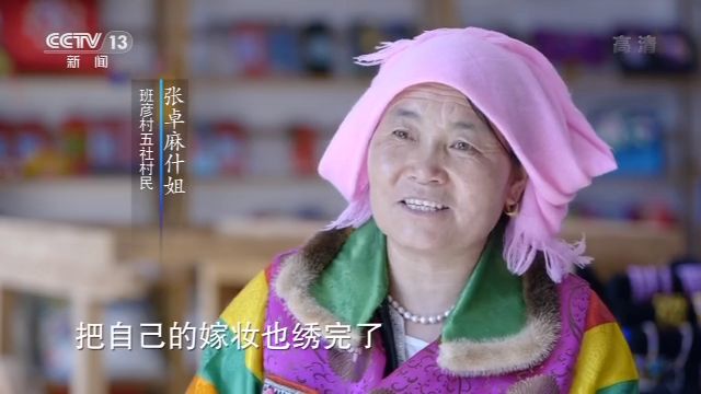 班彦村五社村民 张卓麻什姐:2017年3月金盘绣公司他们来了,(到)我们家来了,他说你们有没有你们做的什么盘绣?他看了我们的盘绣以后,才给我们下的订单,才知道我们的盘绣这么强。去年的话,我们这些绣娘们过来这边做的话,一天20块的补助。现在的这些老人们住在山上的时候,一毛钱都没赚的。现在老人们就挣了一万多(一年)。