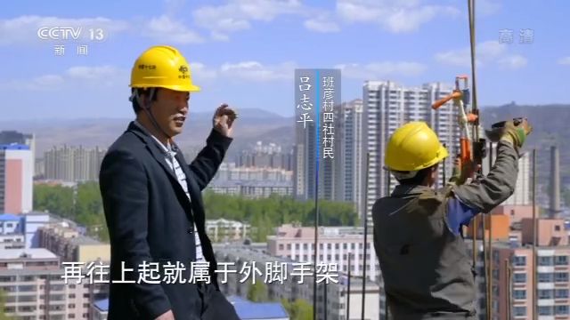班彦村四社村民 吕志平:我承包的是外脚手架,主要负责安全这一块。我踩的这个工字钢,现在它是外脚手架的底部,这个挑起来,然后从这个上面立了钢管,再往上起就属于外脚手架。