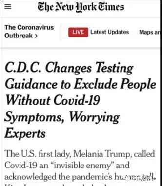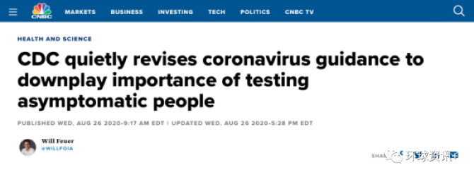 △美国消费者新闻与商业频道(CNBC)报道,美国CDC悄然更改防疫指南,以淡化对新冠肺炎无症状感染者进行病毒检测的重要性