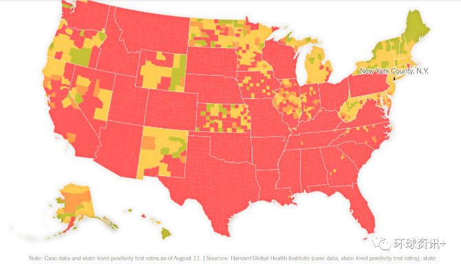 △红色区域均为不适合开学的地区,图自《纽约时报》