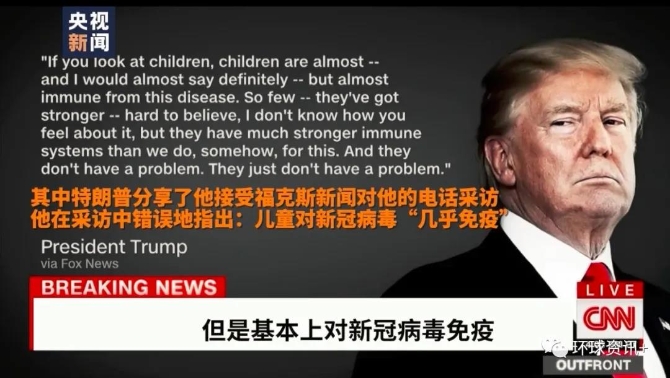 此前,特朗普还在社交平台发布视频称,儿童对新冠病毒“几乎免疫”。但脸书和推特先后删除了相关视频,并称特朗普的这种说法违反了禁止发表有关新冠肺炎的有害错误信息的规定。