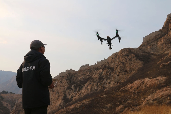 河北省秦皇岛市山海关区长城保护员张鹏用无人机巡查长城(2019年4月11日摄)。新华社发