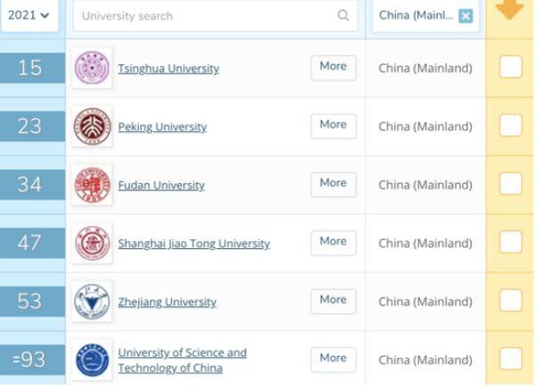 QS中国地区大学排名 图片来源:QS大学排名官网