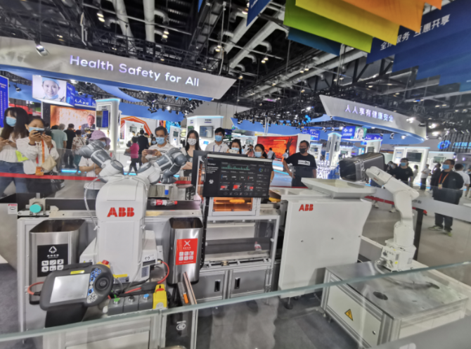 只见一款垃圾分类机器人“眼疾手快”有条不紊地把一桶混合垃圾中的面包、易拉罐、纸屑等分拣得清清楚楚。ABB展台一位工程师介绍说,这是一个将自动化、人工智能与云计算等软硬件技术结合一体的机器人,其集成了华为AI芯片模组,并运用华为云服务,实现整个垃圾识别和分拣过程的自动化。