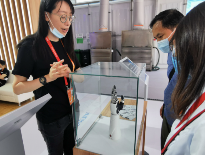 一只银色金属质地、指头关节精致的机器手令人驻足。“这是用于假肢的智能可穿戴AI仿生手,内含微小电机,集合全关节仿生结构、多自由度协同策略、快速机电耦合/解耦机构和柔性触控材料等前沿技术,通过识别肌电信号类别和速度,实现对仿生手的位置和速度精确控制,完成日常生活中80%常见动作,可应用于上肢伤残人士、辅助装配、智慧工厂、物流搬运、高危处置、精密制造和科研教学等场景。”智能科技专题展区京东机器人产品部产品经理常荻介绍。