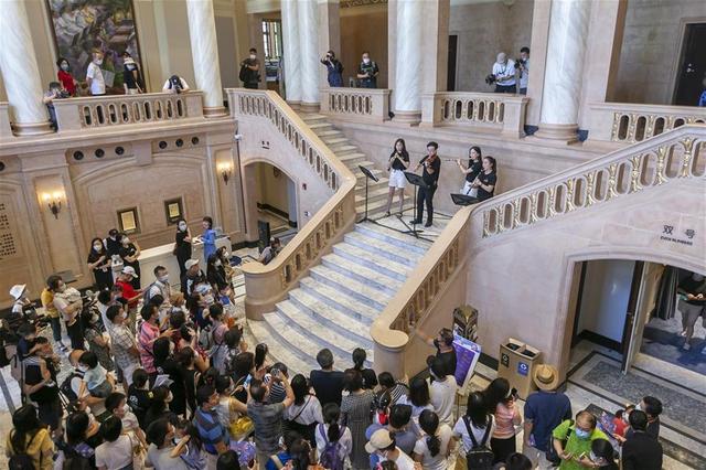 9月6日,以上海音乐厅员工为班底组成的重奏乐团“厅默森”在上海音乐厅北厅奏响开厅第一曲。 当日,历时一年半封闭式修缮的上海音乐厅重新向公众开放,并举办“相·见”主题开放日特别活动。邀请观众第一时间进入音乐厅,了解修缮细节,感受建筑之美。 上海音乐厅建于1930年,是上海知名文化地标之一。此次修缮对2000多平方米的“文保区域”严格修旧如旧,恢复原有风貌;非文保区域则重新装饰装修,提升功能。 新华社记者 王翔 摄