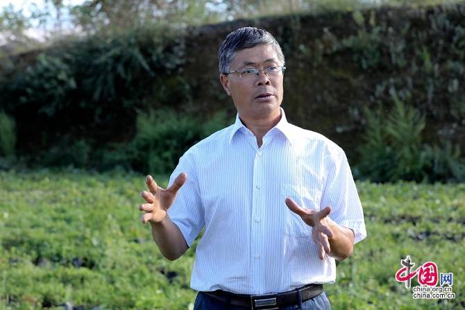 当地脱贫致富路上的“领头大哥” 谭正义向记者介绍纳雍县雾翠茗香示范园区循环农业“猪-沼-茶-草”循环农业产业链。中国网记者 董宁摄影