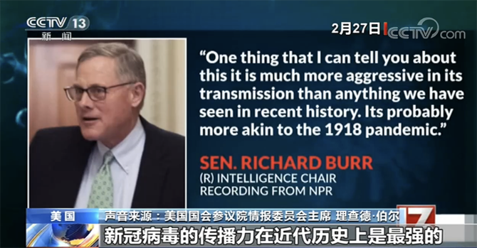 美国国会参议院情报委员会主席 理查德·伯尔:我能告诉你们的是新冠病毒的传播力在近代历史上是最强的,这次疫情很可能会像1918年大流感一样严重。
