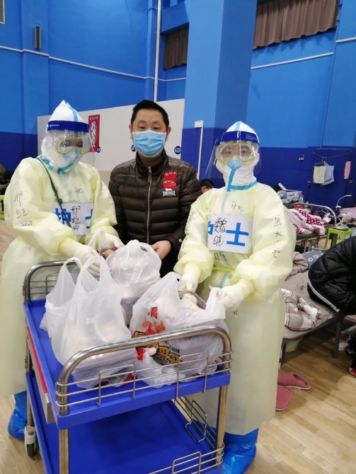 图为胡惠东在方舱医院帮助医护人员送饭菜。