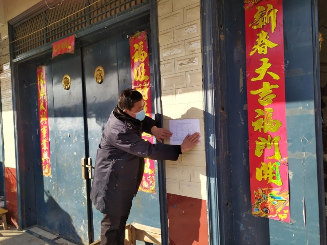 图为汤玉峰带领村干部张贴疫情防控排查记录表。
