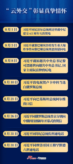 书信传情谊,云端促合作。8月,习近平主席通过致信函、通电话等方式继续开展“云外交”。