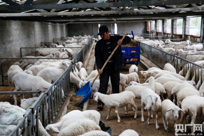 一位贫困户正在喂羊(央广网记者 张凯航 摄)
